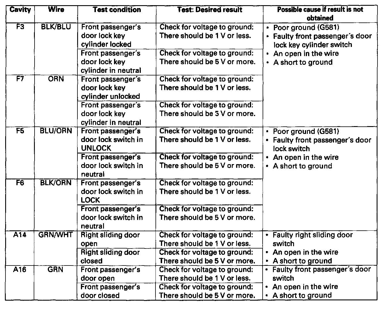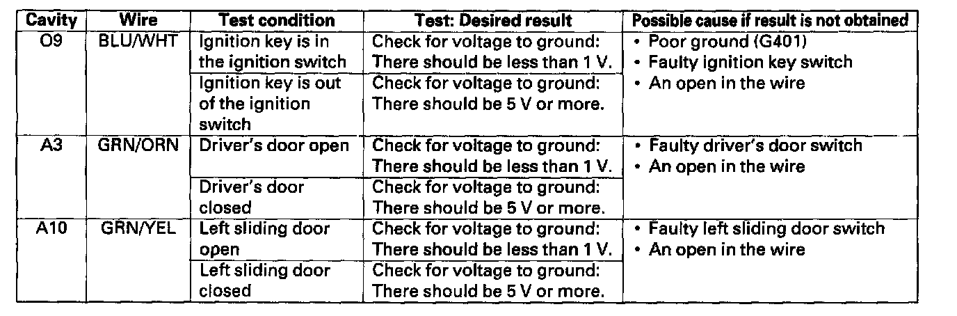 13. Reconnect the connector to the door unit, and perform the following input tests at the connectors.