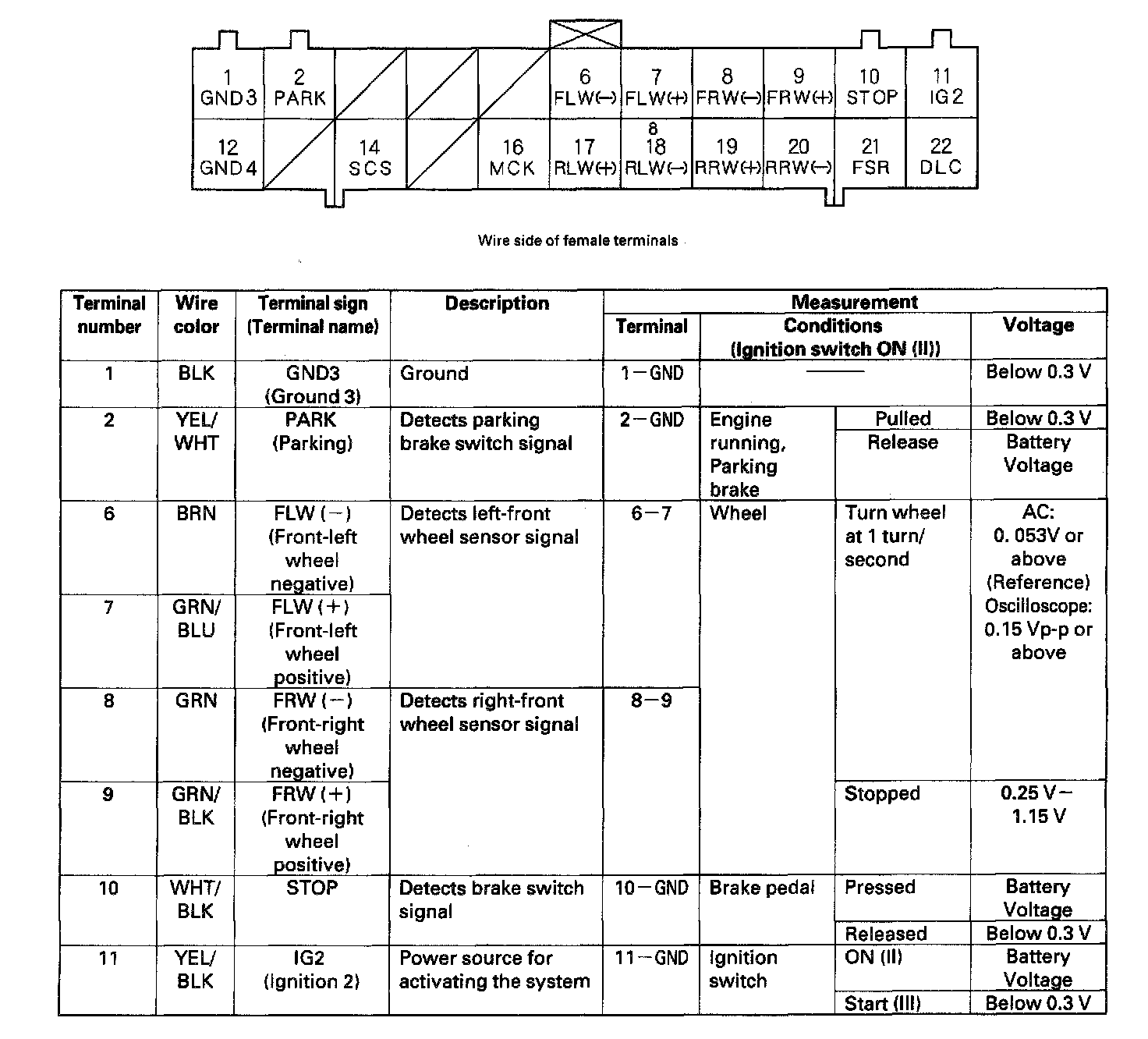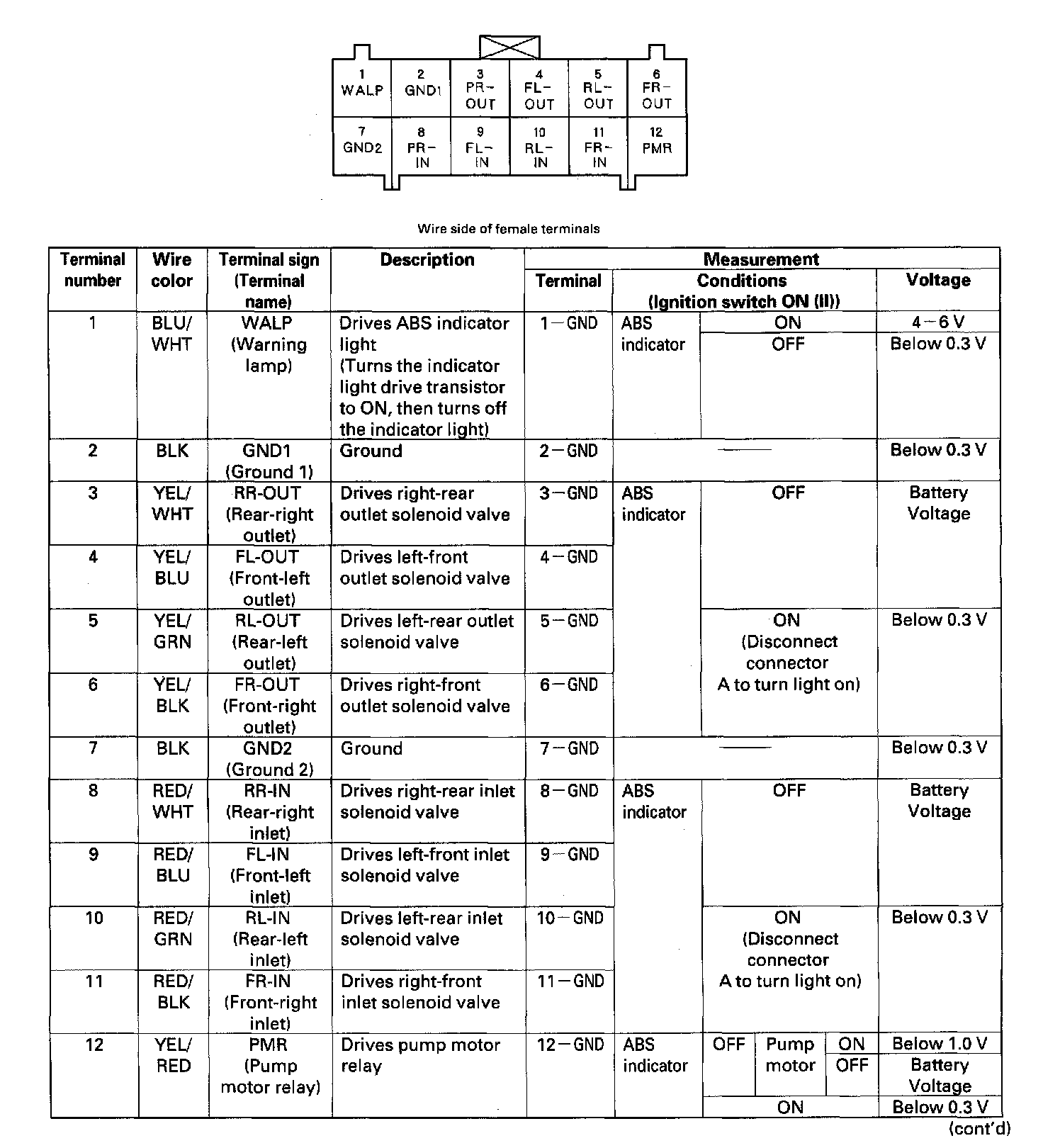 ABS Control Unit Inputs and Outputs for Connector A (22P)