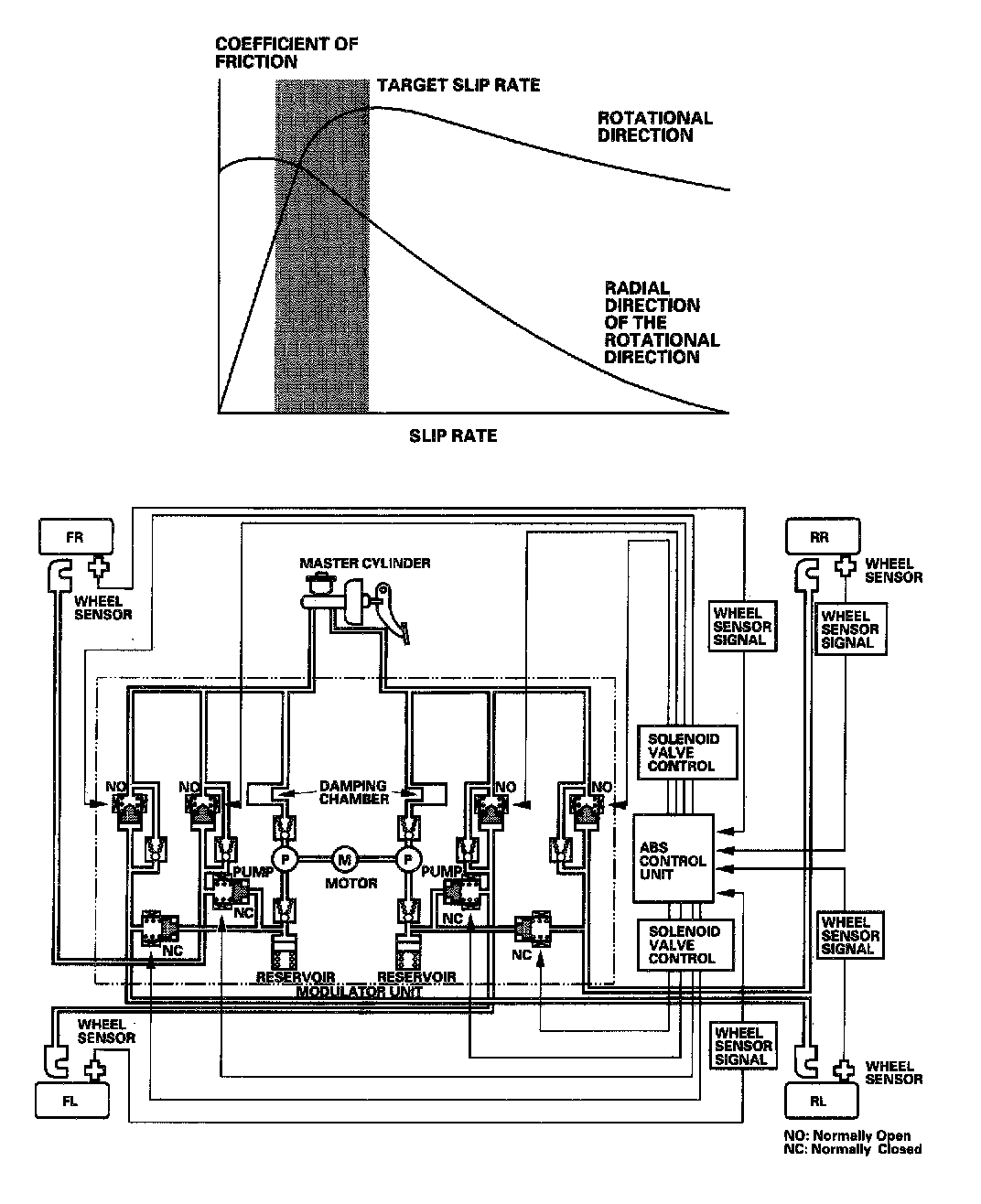 The ABS control unit calculates the slip rate of each wheel, and it transmits the control signal to the modulator unit solenoid valve when the slip rate is high.
