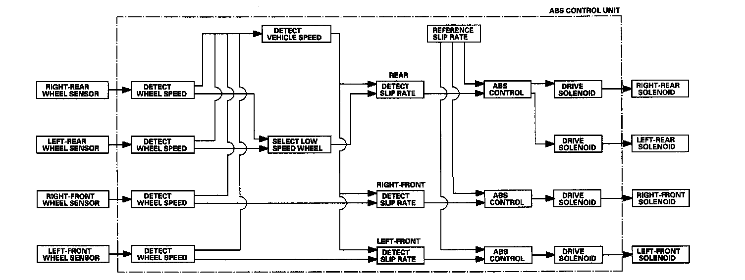 The ABS control unit detects the wheel speed based on the wheel sensor signal it received, then it calculates the vehicle speed based on the detected wheel speed. The control unit detects the vehicle speed during deceleration based on the rate of deceleration.