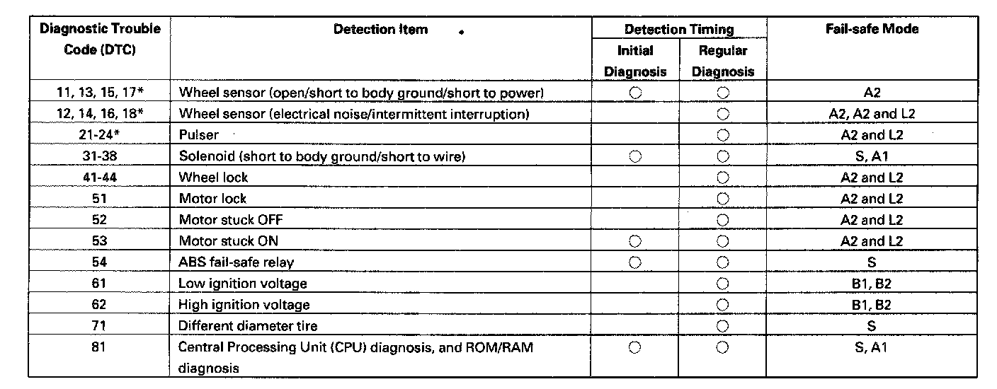 - At the DTCs with "*" mark, there are cases that the ABS control unit shifts to fail-safe mode A1, L1 when the ABS control unit detects more than one DTC and for different wheel.