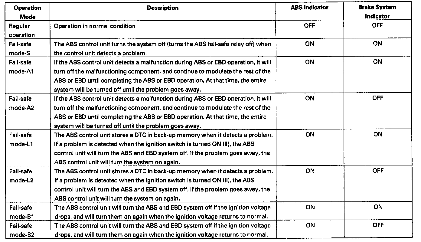 - If the ABS control unit detects the DTCs which have different fail-safe mode individually, the control unit take priority the large number mode.