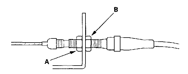 6. Pull the cable so that the adjusting nut (B) touches the bracket, and tighten the locknut (A).