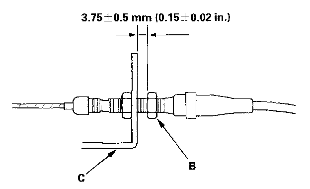 5. Turn the adjusting nut (B) until it is 3.75 ± 0.5 mm (0.15 ± 0.02 in.) away from the bracket (C).