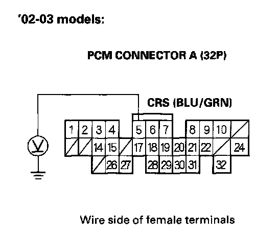9. Connect a voltmeter between PCM connector terminal A5 ('99-00, '02-03 models) or E17 ('01 model) and body ground Drive the vehicle at speeds over 25 mph (40 km/h) with the cruise control set, and watch the voltmeter.