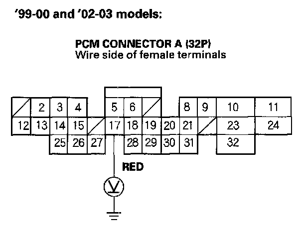13. '99-00 and '02-03 models: Using the Backprobe Set, measure the voltage between the No.17 terminal of PCM connector A (32P) and body ground with the PCM connectors connected '01 model. Using the Backprobe Set, measure the voltage between the No.12 terminal of PCM connector E (31P) and body ground with the PCM connector connected.