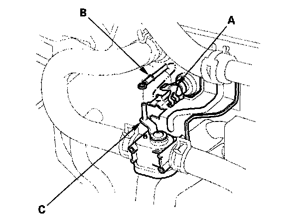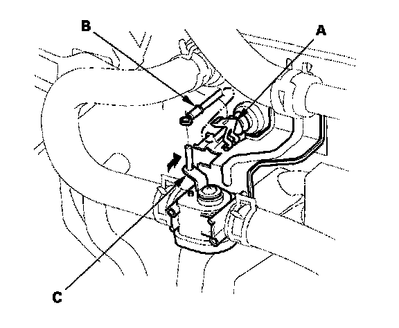 Heater Valve Cable Adjustment1. From under the hood, open the cable clamp (A), then disconnect the heater valve cable (B) from the heater valve arm (C).
