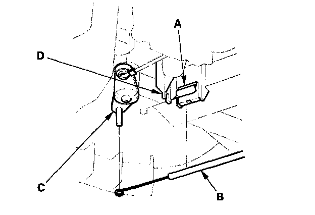 4. Attach the heater valve cable (B) to the air mix control linkage (C) as shown above. Hold the end of the heater valve cable housing against the stop (D), then snap the heater valve cable housing into the cable clamp (A).
