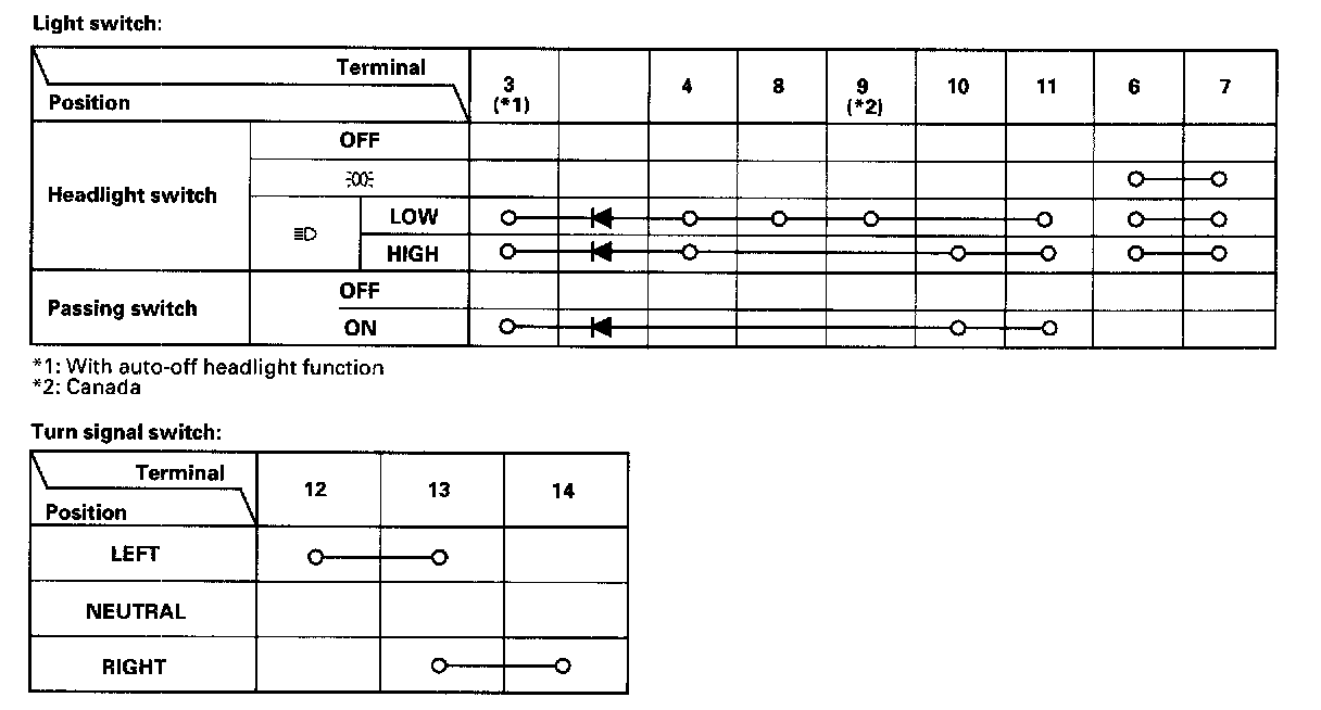 - If the terminals look OK, check for continuity between the terminals in each switch position according to the tables.