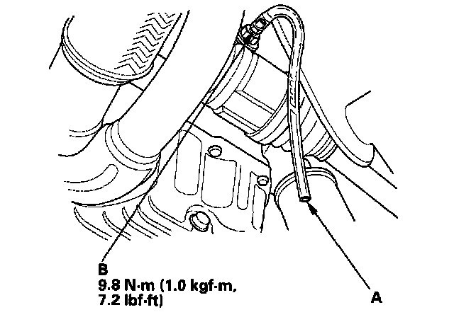 4. Install a rubber hose (A) on the drain bolt (B) located at the rear of the cylinder block, then loosen the drain bolt.