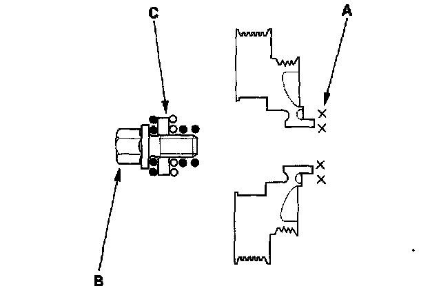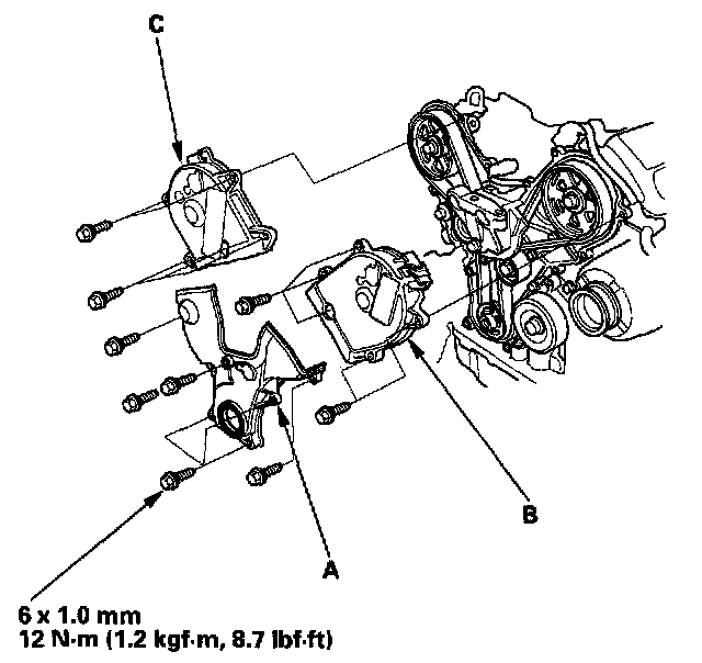 11. Clean any oil off the inside face (A) of the crankshaft pulley, and apply lubricant to the pulley bolt (B) and washer (C).