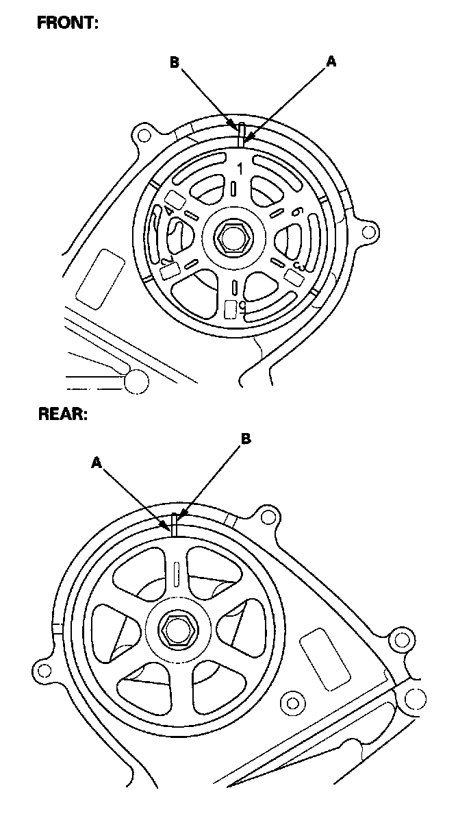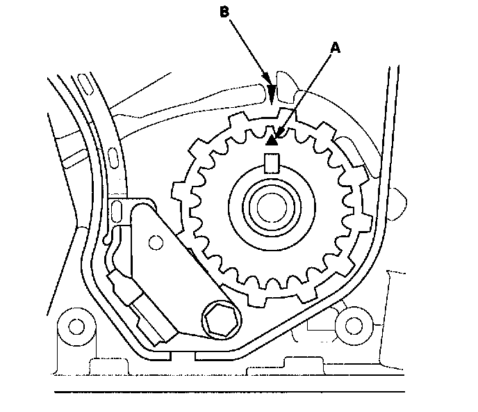 2. Set the timing belt drive pulley to TDC by aligning the TDC mark (A) on the tooth of the timing belt drive pulley with the pointer (B) on the oil pump.