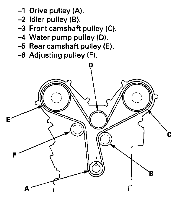 5. Install the timing belt in a counterclockwise sequence starting with the drive pulley. Take care not to damage the timing belt when installing it.