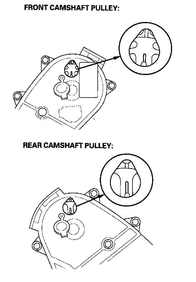 3. Clean the camshaft pulleys. Set the camshaft pulleys to TDC by aligning the TDC marks (A) on the camshaft pulleys with the pointers (B) on the back covers.