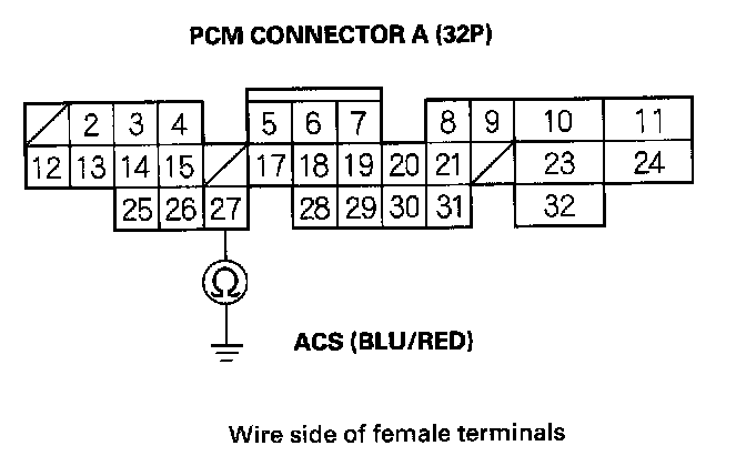 14. Check for continuity between body ground and PCM connector terminal A27.