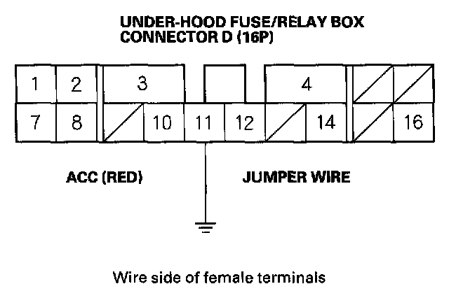 15. Momentarily connect the under-hood fuse/relay box 16P connector terminal No.11 to body ground with a jumper wire several times.