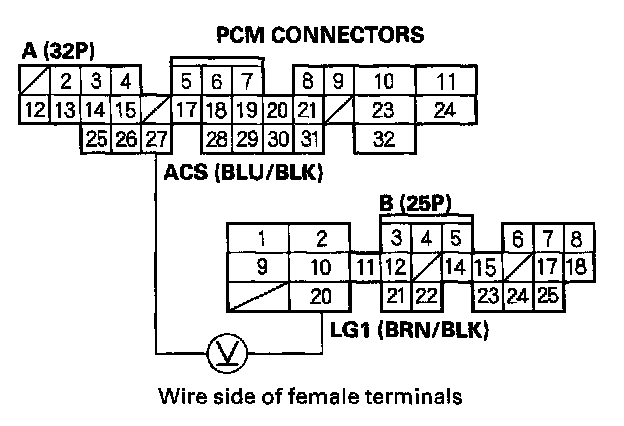 4. Measure voltage between PCM connector terminals A27 and B20.