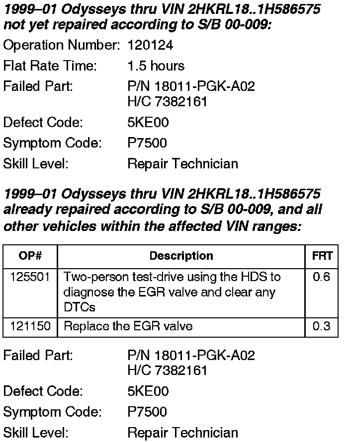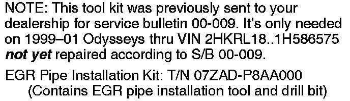 If you are working on a 1999-01 Odyssey thru VIN 2HKRL18..1H586575 not yet repaired according to S/B 00-009, do not do this diagnosis; go to REPAIR PROCEDURE B: EGR PORT CLEANING AND INSTALLATION OF EGR PIPE KIT.