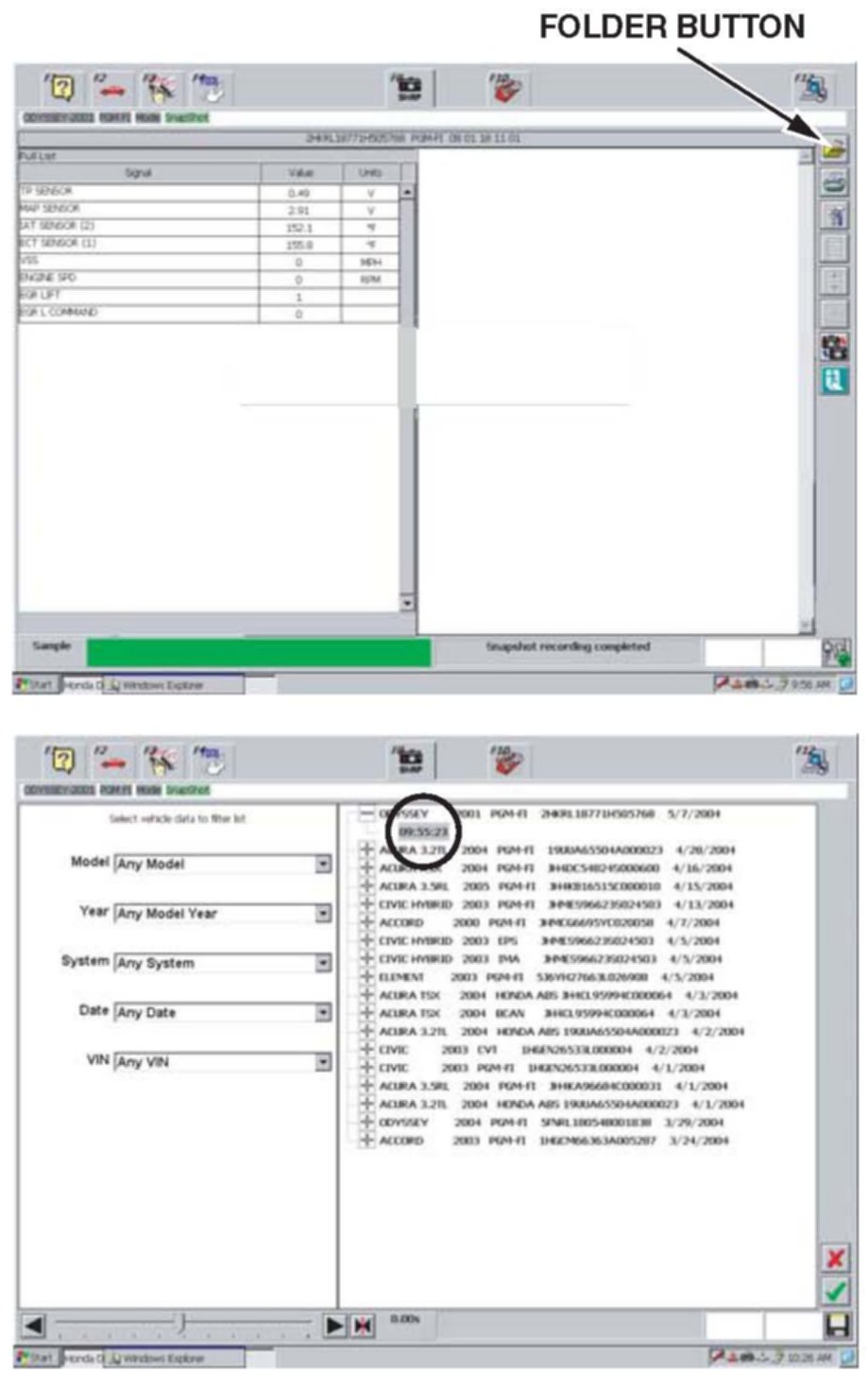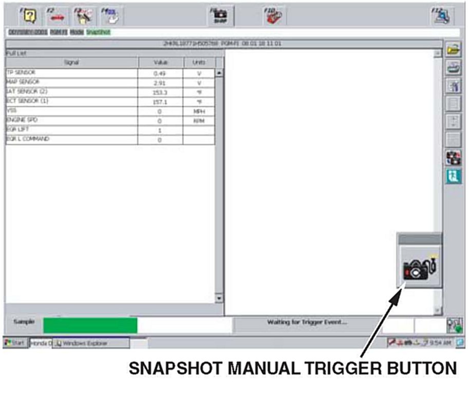 11. With the engine completely warmed up, have an assistant drive the vehicle while you operate the HDS. Drive the vehicle between 40 and 55 mph on a smooth road. Apply light throttle with the transmission in 5th gear (between 1,500 and 2,000 rpm). If hesitation is felt, select the Snapshot Manual Trigger button.