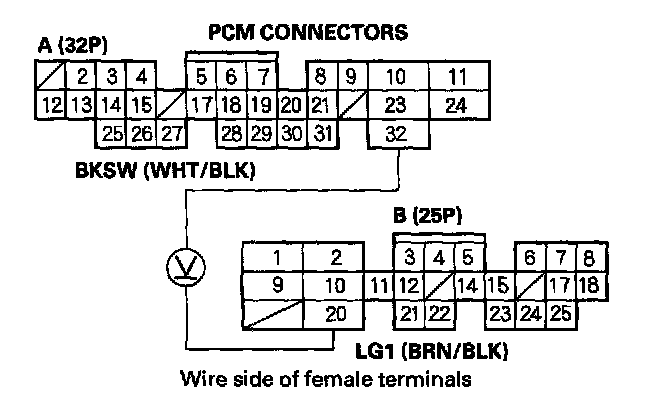 3. Measure voltage between PCM connector terminals A32 and B20 with the brake pedal pressed.