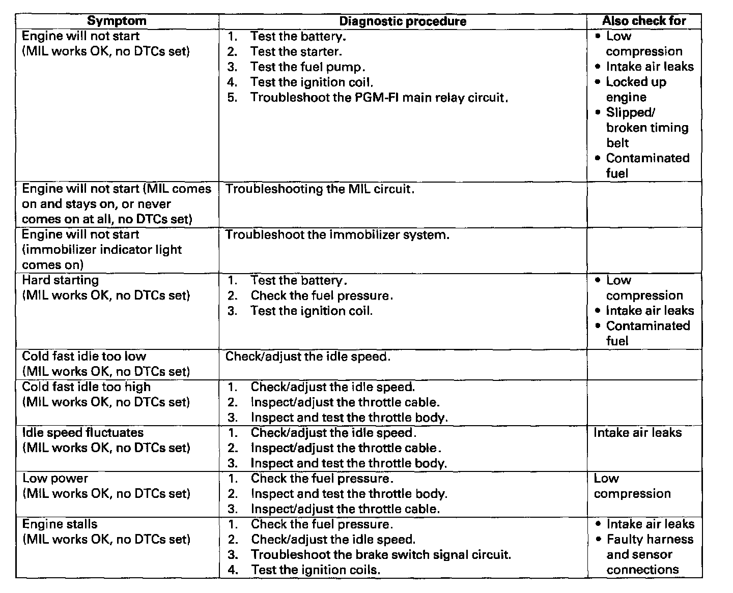 Symptom Troubleshooting IndexThese symptoms DO NOT trigger Diagnostic Trouble codes (DTCs) and cause the Malfunction Indicator Lamp (MIL) to come on. If the MIL is reported on, check for DTCs. If the vehicle has one of these symptoms, do the diagnostic procedure for it, in the sequence listed, until you find the cause.
