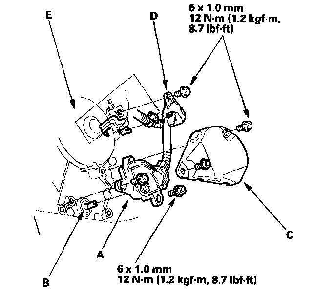 10. Install the A/T gear position switch cover (C), and the harness clamp (D) on the end cover (E).