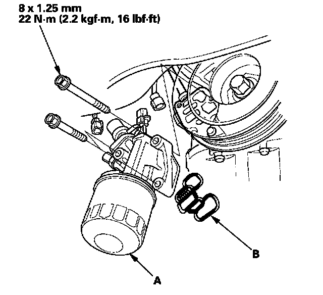 3. If the resistance is within specifications, remove the VTEC solenoid valve/oil filter assembly (A) from the oil pump, and check the VTEC solenoid valve filter (B) for clogging. If there is clogging, replace the engine oil filter and the engine oil.