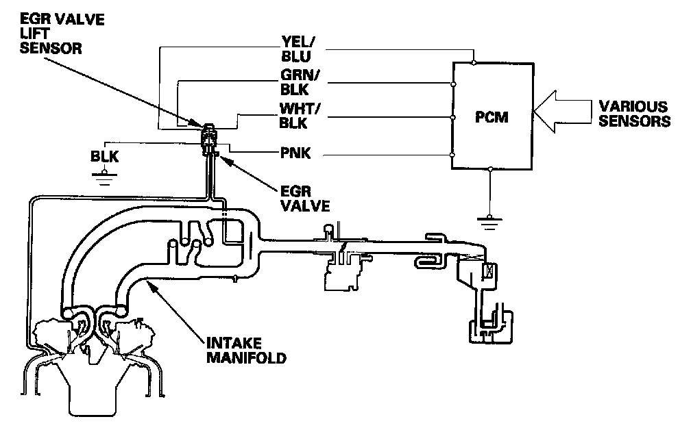The EGR valve lift sensor detects the amount of EGR valve lift and sends it to the PCM. The PCM then compares it with the ideal lift in its memory (based on signals sent from other sensors). If there is any difference between the two, the PCM cuts current to the EGR valve.