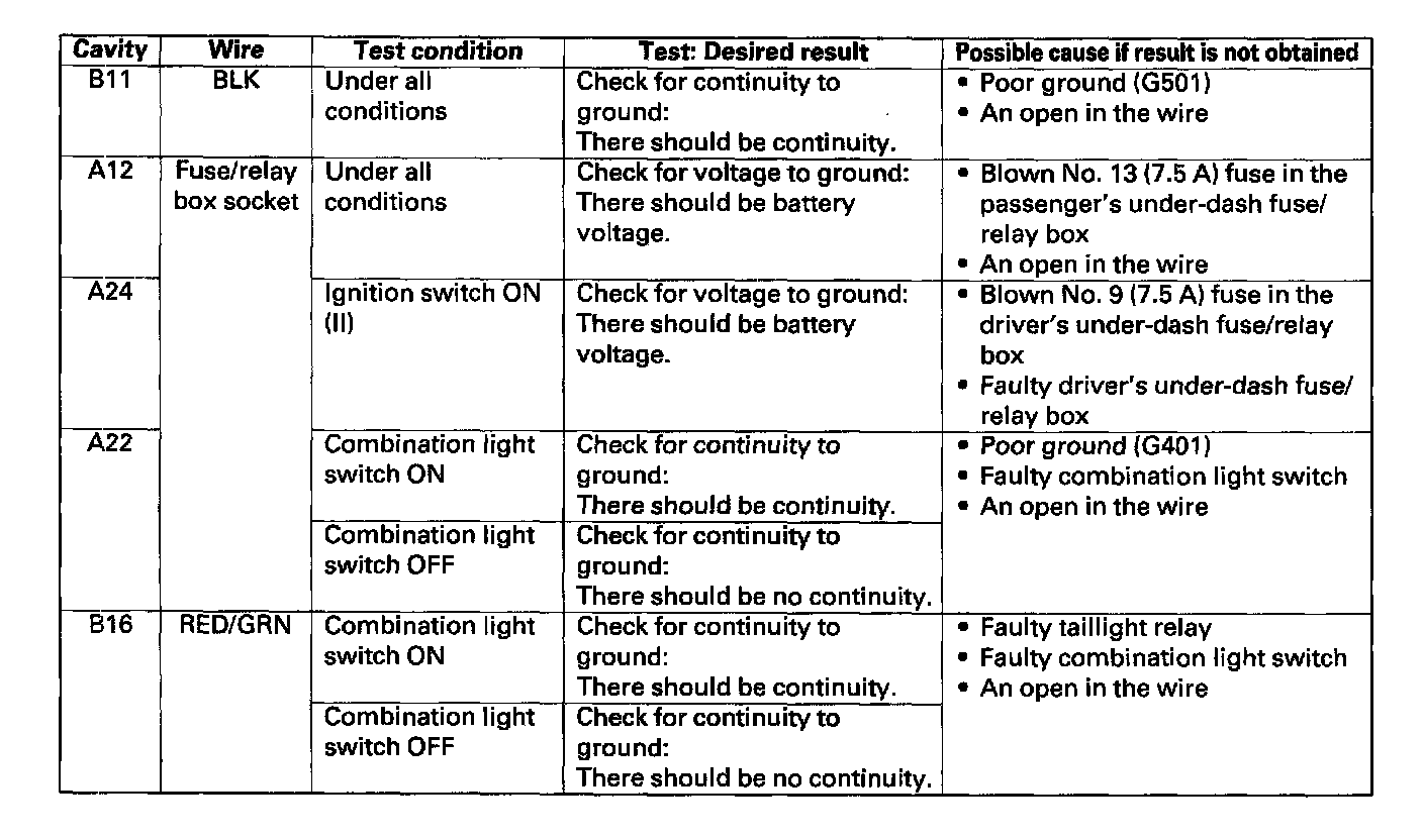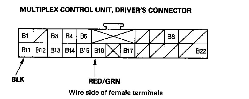5. Reconnect the driver's multiplex control unit to the fuse/relay box, and perform the following input tests at the appropriate connectors on the back of the fuse/relay box.