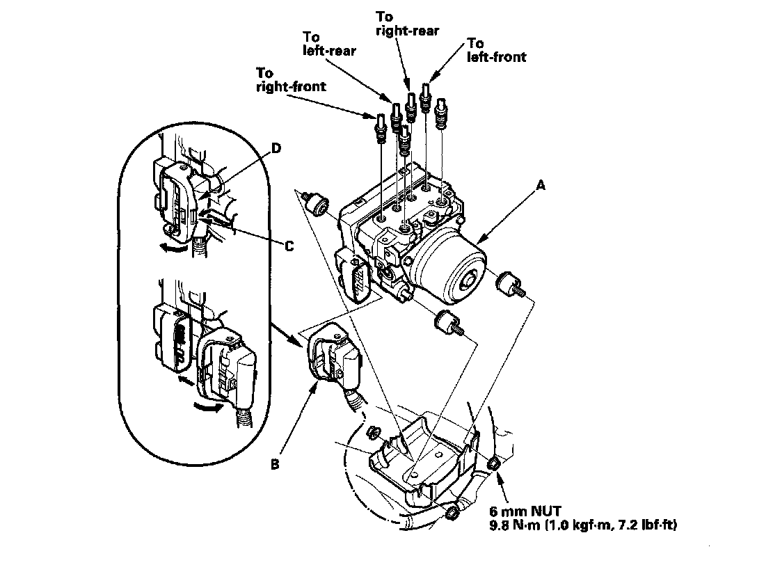 1. Install the modulator unit, then connect the brake lines. Tighten the flare nuts to 15 Nm (1.5 kgf-m, 11 ft. lbs.).