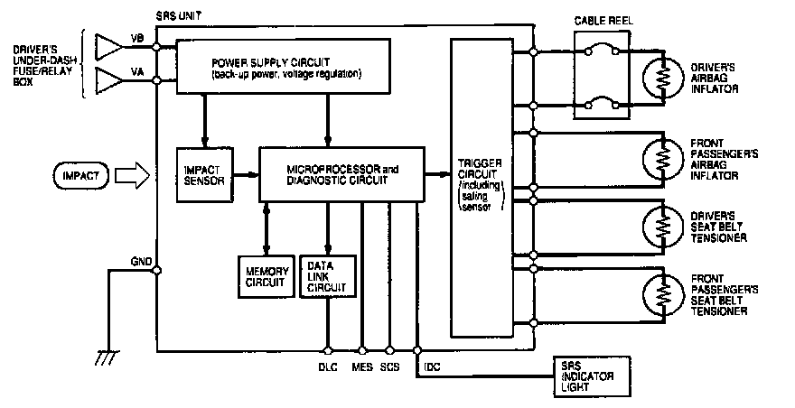 The main circuit in the SRS unit senses and judges the force of impact and, if necessary, ignites the inflator charges. If battery voltage is too low or power is disconnected due to impact, the voltage regulator and the back-up power circuit respectively will keep voltage at a constant level.