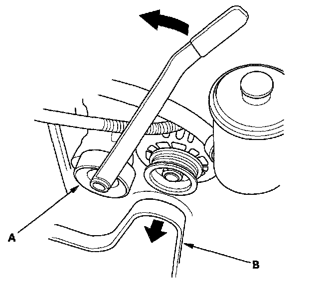 1. Check that the pointer (A) on the auto-tensioner housing is not beyond the edge of the indicator rib (B) on the tensioner base.