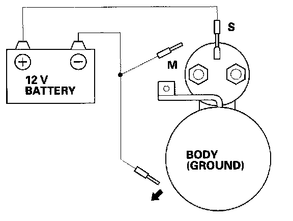 3. Connect the battery as shown. Be sure to disconnect the starter motor wire from the solenoid. If the starter pinion pops out, it is working properly.
