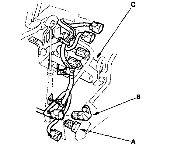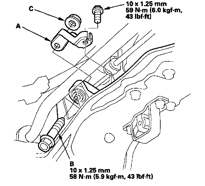 39. Install the harness cover (A) on the transmission hanger (B), then install the connector bracket (C).