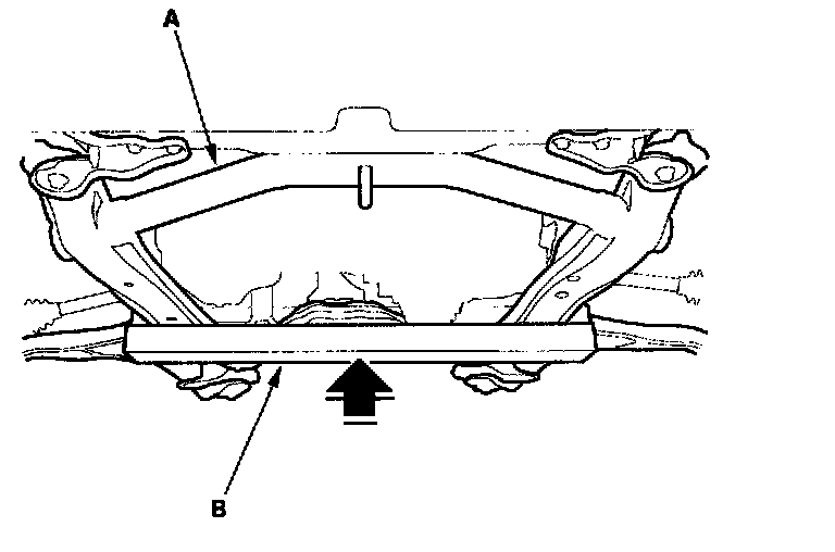 16. Support the sub-frame (A) with a 4 inch x 4 inch x 58 inch piece of wood (B), then lift it up to the body.