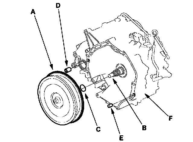 9. Attach the torque converter to the drive plate (B) with eight bolts (C). Rotate the crankshaft pulley as necessary to tighten the bolts to 1/2 of the specified torque, then to the final torque, in a crisscross pattern. After tightening the last bolt, check that the crankshaft rotates freely.