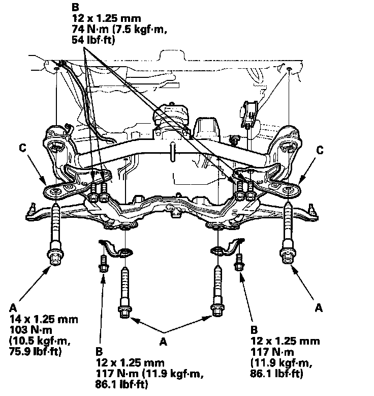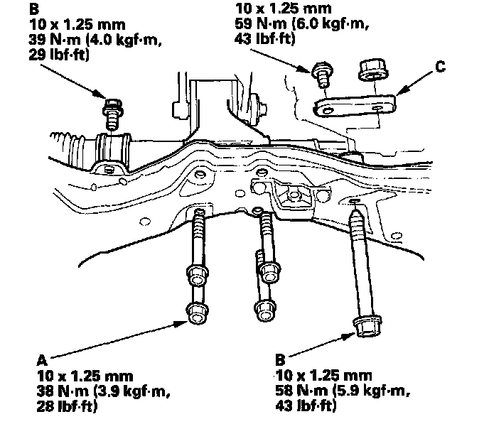 22. Install the stiffener (A) and the steering gearbox mounting bolt (B) with nut (C).