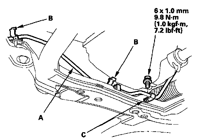 19. Install the power steering fluid pipe (A) on the clamps (B), and install the power steering fluid pipe bracket(C).