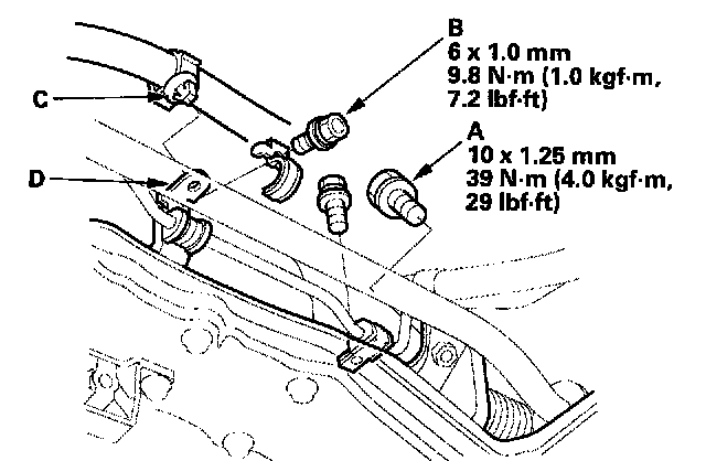 24. Install the power steering fluid return hose clip (C) on the bracket (D).