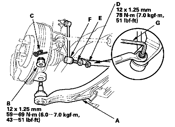 26. Install the nut (D) to the ball joint pin (E) on the stabilizer link (F), then use a 6 mm Allen-type wrench (G), and tighten the nut to the specified torque.