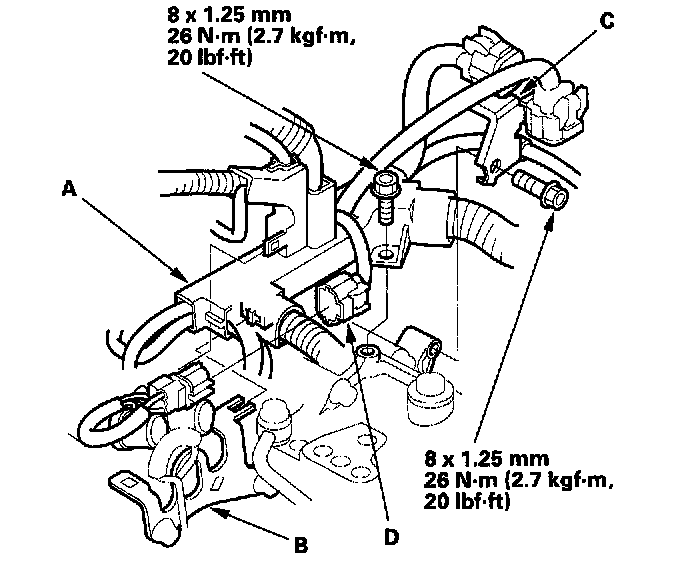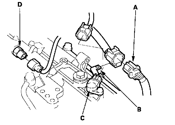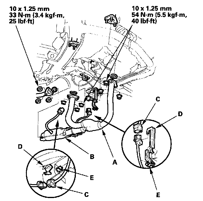 28. Connect the oxygen sensor connectors (C), then install them on their connector brackets (D). Install the harnesses on the clamps (E).