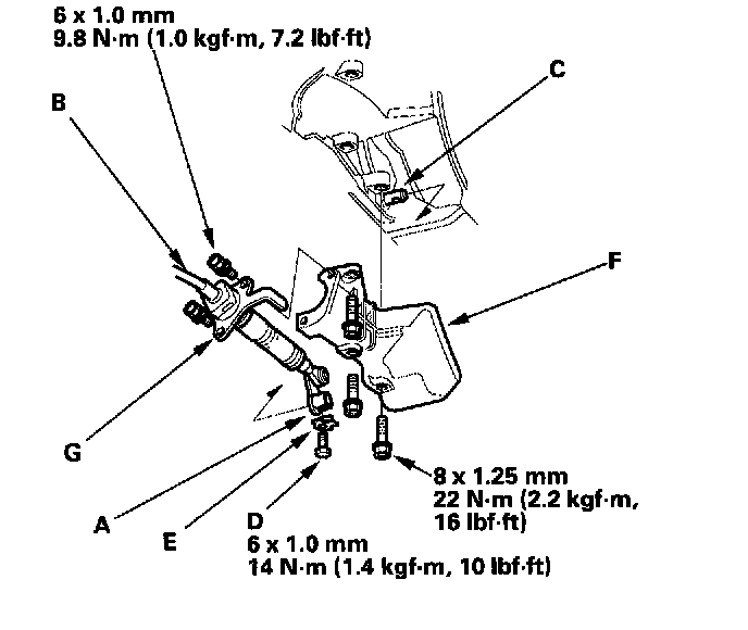 31. Install the shift cable cover (F), then install the shift cable holder (G) on the shift cable cover.