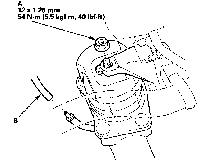 23. Install the steering gearbox mounting bolt (A) and the power steering fluid pipe bracket bolts (B).
