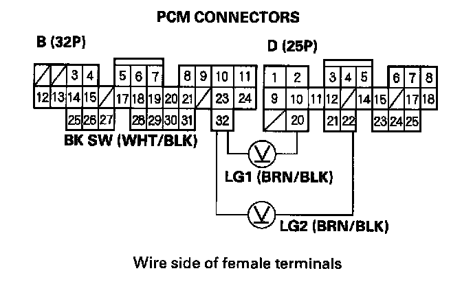 7. Depress the brake pedal and measure the voltage between the A32 and B20 or B22 terminals.