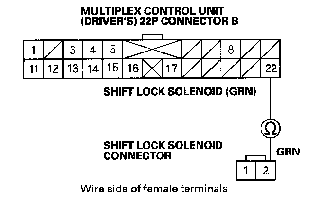 17. Check for continuity between the No. 2 terminal of the shift lock solenoid connector and the No. 22 terminal of the multiplex control unit (driver's) 22P connector B.