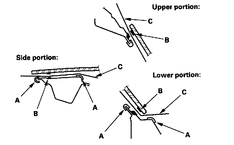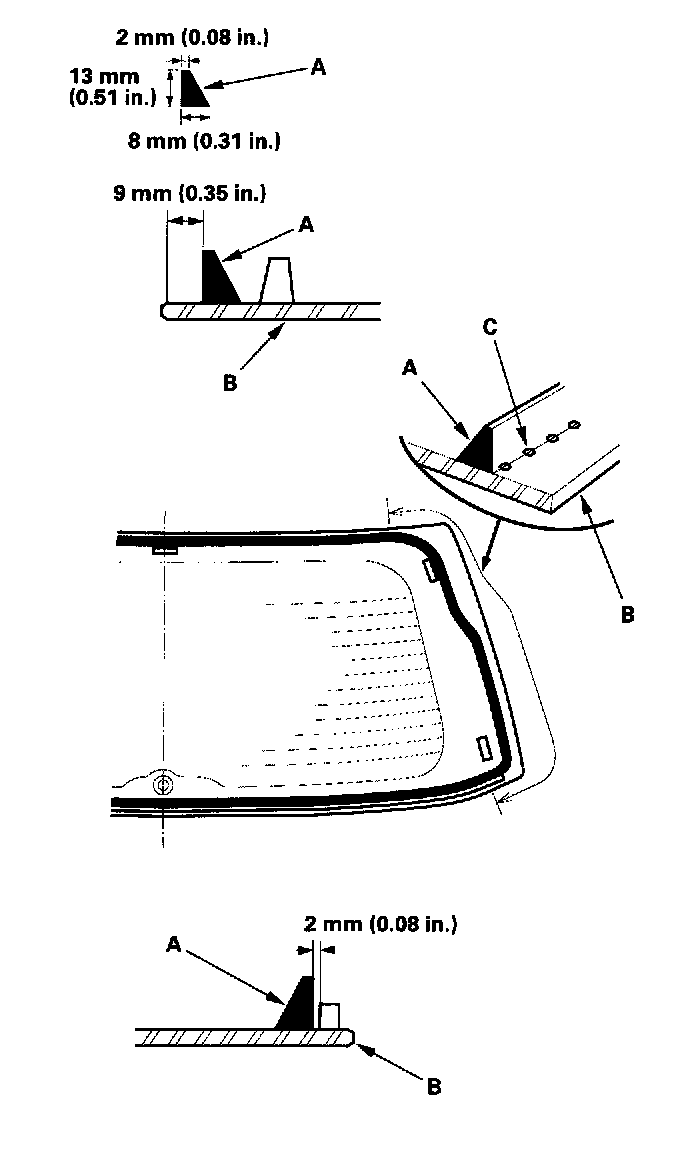 17. Pack adhesive into the cartridge without air pockets to ensure continuous delivery. Put the cartridge in a caulking gun, and run a bead of adhesive (A) around the edge of the rear window (B) as shown. With the printed dots (C) on the rear window as a guide, apply the adhesive to both side portions of the rear window.