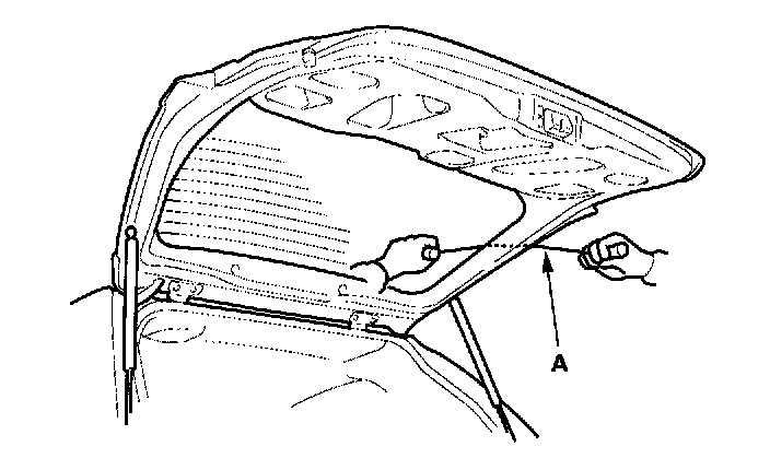 4. With a helper on the outside, pull the piano wire (A) back and forth in a sawing motion. Hold the piano wire as close to the rear window as possible to prevent damage to the tailgate, and carefully cut through the adhesive around the entire rear window.