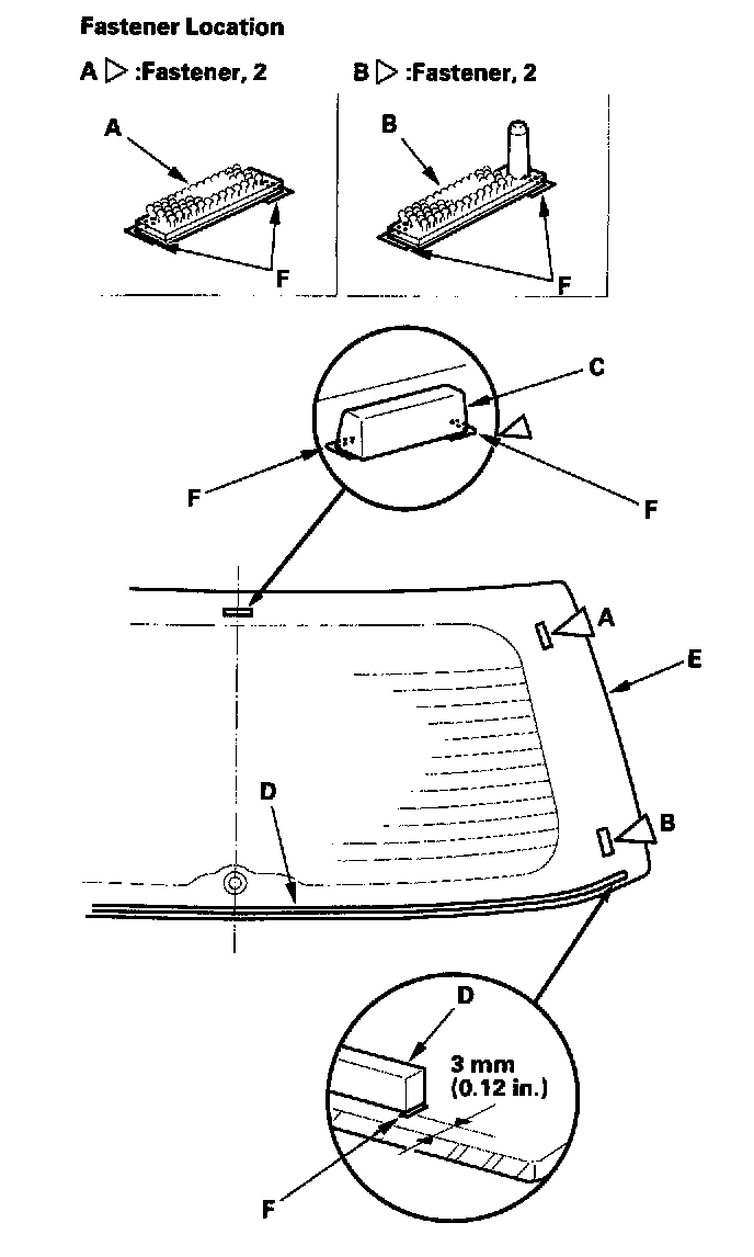 9. Glue the upper corner fasteners (A), lower corner fasteners (B), upper spacer (C) and lower rubber dam (D) to the inside surface of the rear window (E) as shown: