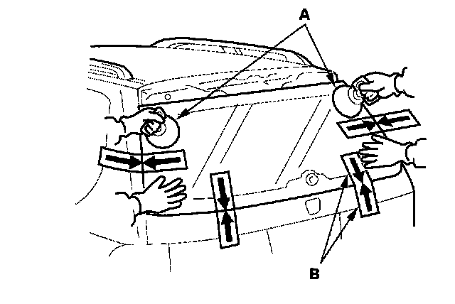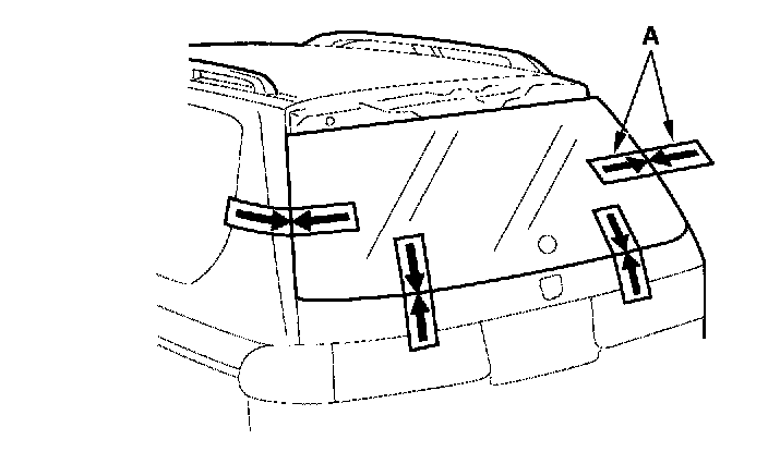 11. Set the rear window in the opening, and center it. Make alignment marks (A) across the rear window, tailgate and body with a grease pencil at the four points shown. Be careful not to touch the rear window where adhesive will be applied.