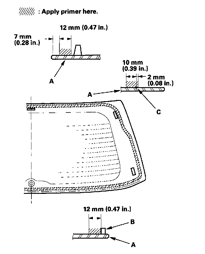 - With the printed dots (C) on the rear window as a guide, apply the glass primer to both side portions of the rear window.